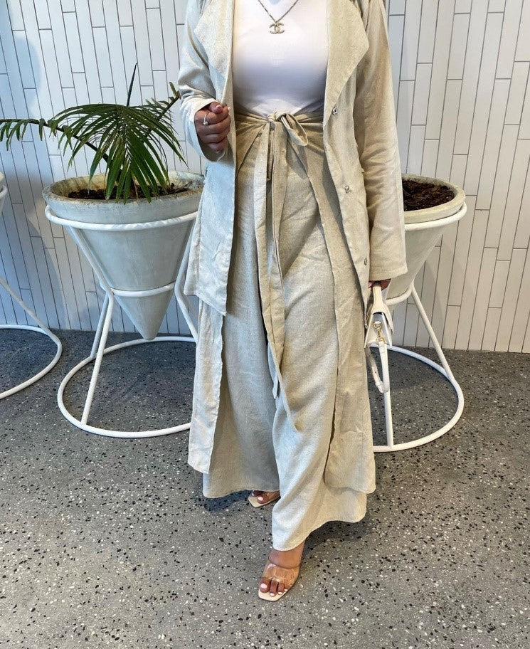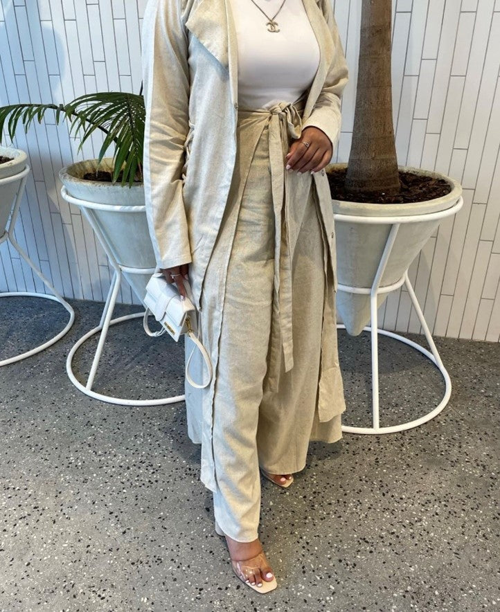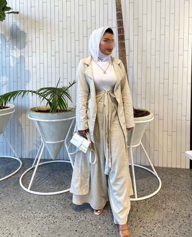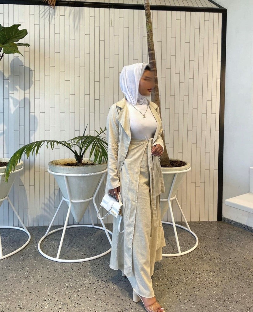 A set of lightweight, breathable linen fabric that is both comfortable and durable. It is suitable for many occasions, including the office, evening wear, and formal wear. The suit is simple and elegant with a tailored silhouette and a structured jacket.